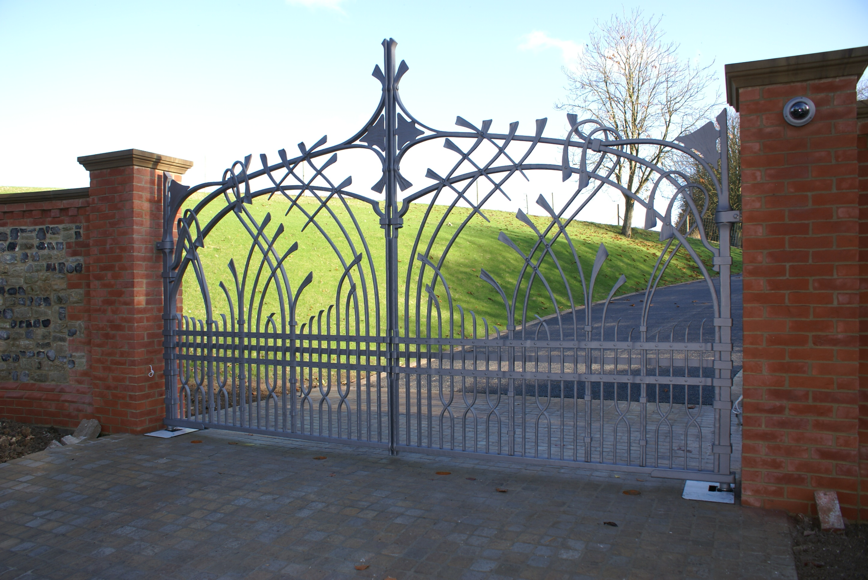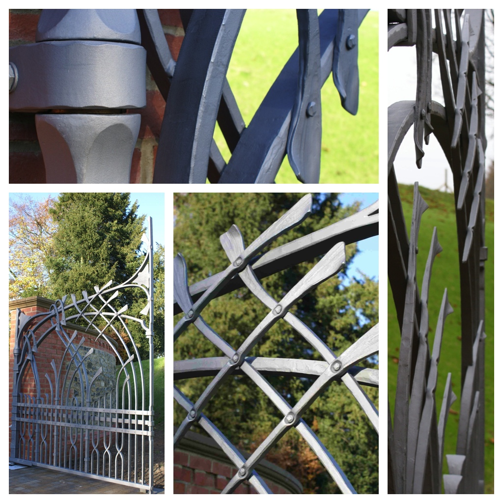 This one half of a pair of gates we designed and made last year (2011) and are worth a revisit. The gates are made from very large, solid sections of mild steel and are fully hammer textured. There is extensive hot riveting throughout the construction. Unfortunately the picture shows how difficult it is sometimes to photograph ironwork satisfactorily.