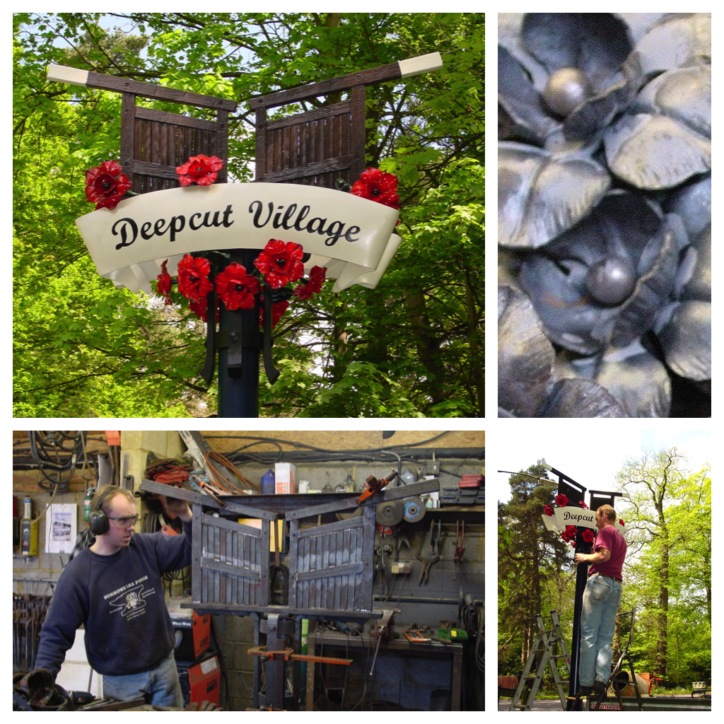 The Deepcut village sign was commissioned in 2002 by Surrey Heath Borough Council. The design concept was inspired in conversation by the Deepcut Lock Keeper at that time, Peter Munt. The design jumped into my mind as soon as he mentioned that he was always sorry to have to cut back beautiful wild roses each year so that the Lock gates could be operated safely by the canal users.