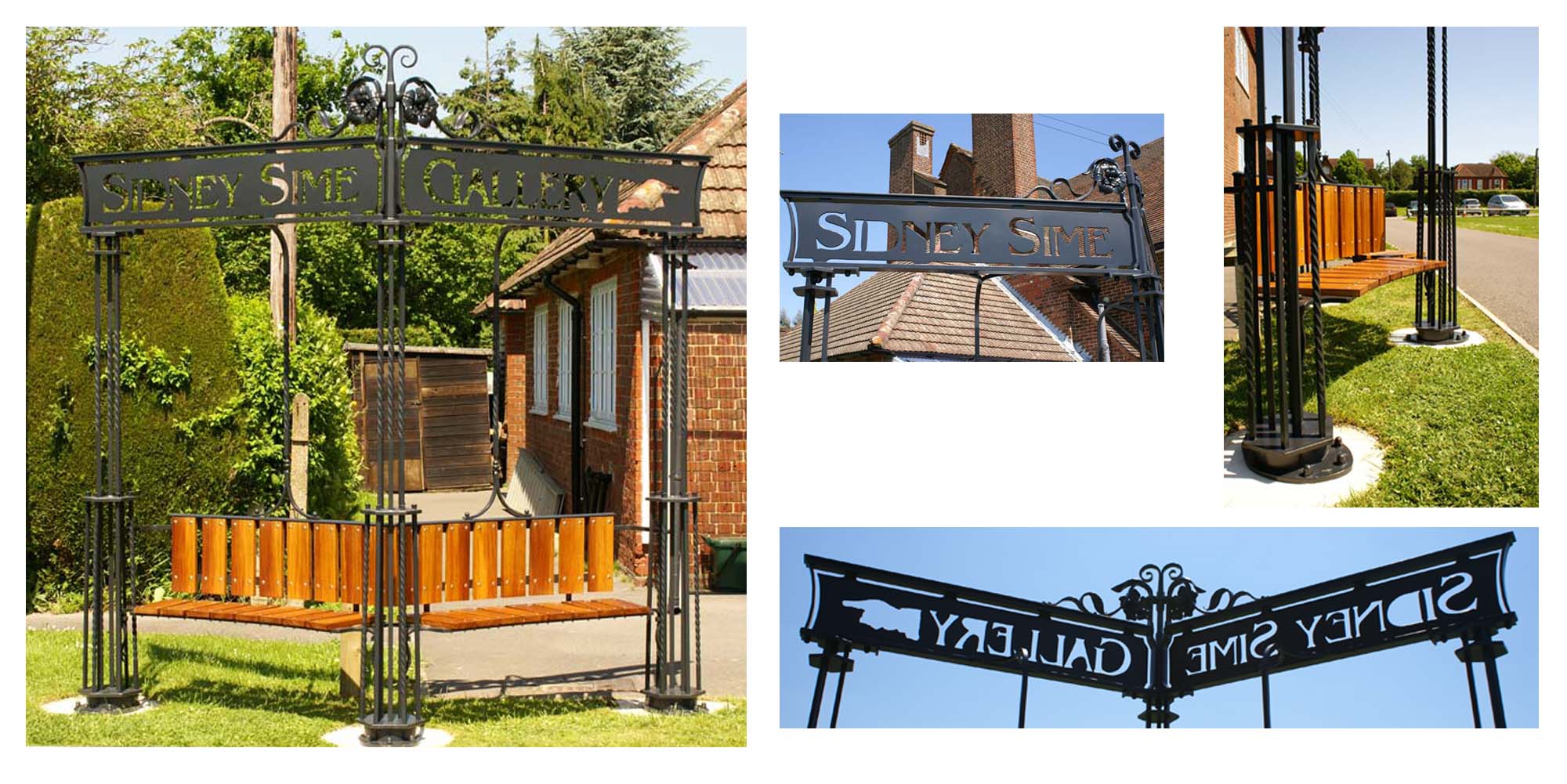 The design is based upon one of Sidney Sime’s sketches. I interpreted it and drew full size drawings to enable the structure to be made. These sort of 3D structures need to be draw to full size otherwise they can be near impossible to make economically. The main structure is Mild Steel and there is some beautiful hot forged detailing, namely the leaves and roses surmounting the sign boards. The metalwork has been hot zinc sprayed (cathodic protection) and powder coated in a very dark grey. The seating is made from Hardwood Iroko supplied and machined for us by Mayford Joinery, it has an oiled finish. All the fixings are made from Stainless Steel.