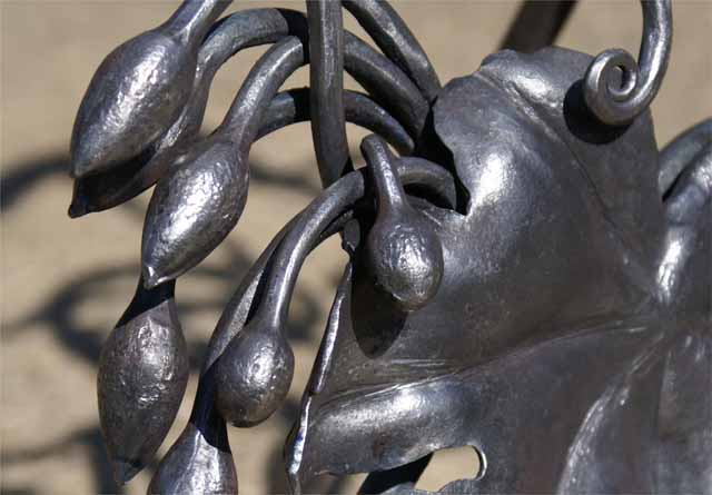 We discussed Bacchus, the god of indulgence, the Horn of Plenty, grapes, fruit and what too many good times can do to you. So a Horn of Plenty Gate adorned with vines, fruit and a bit wobbly was the result…… perfect as the gate was to be sited at the head of a narrow stair to a wine tasting cellar, against a rustic brick wall and to be seen from a French Provence inspired kitchen.